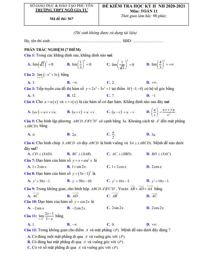 Đề thi học kỳ 2 môn Toán lớp 11 năm 2020 – 2021 của trường THPT Ngô Gia Tự – Phú Yên có mã đề 567, bao gồm 04 trang với tổng cộng 35 câu trắc nghiệm và 03 câu tự luận. Thời gian làm bài là 90 phút, và đề thi đi kèm đáp án cho các câu trắc nghiệm cùng lời giải chi tiết cho các câu tự luận.