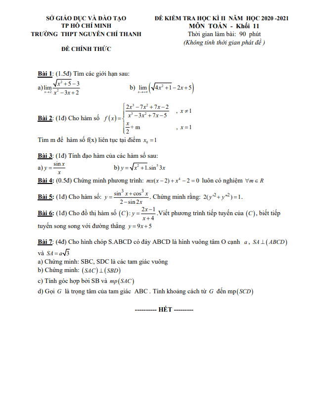Chào mừng đến với đề thi học kỳ 2 môn Toán lớp 11 năm học 2020 – 2021 của trường THPT Nguyễn Chí Thanh, TP HCM. Đề thi bao gồm 9 bài toán có dạng tự luận, mỗi bài học sinh sẽ có 90 phút để làm. Đề thi cũng đi kèm với đáp án và lời giải chi tiết.