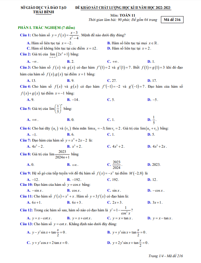 Đề thi học kì 2 (HK2) lớp 11 môn Toán năm 2022 2023 sở GD ĐT Thái Bình
