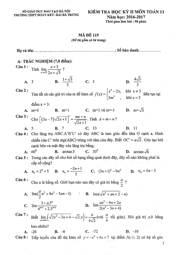 Đề thi học kỳ 2 (HK2) lớp 11 môn Toán năm học 2016-2017 trường THPT Đoàn Kết Hai Bà Trưng Hà Nội