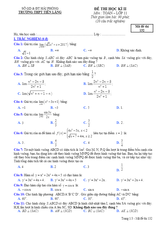 Đề thi học kì 2 (HK2) lớp 11 môn Toán năm học 2016 2017 trường THPT Tiên Lãng Hải Phòng