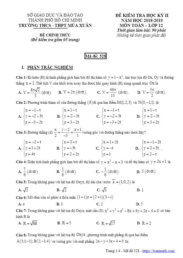 Trường THCS-THPT Mùa Xuân, TP HCM đã tổ chức kỳ thi kiểm tra học kỳ 2 môn Toán lớp 12 năm học 2018-2019 để đánh giá chất lượng học tập của học sinh. Đề thi có mã đề 528, bao gồm 30 câu trắc nghiệm và 4 câu tự luận, tổng cộng là 10 điểm. Thời gian làm bài là 90 phút.