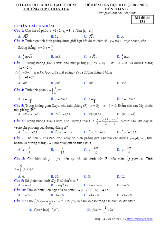 Để đánh giá chất lượng môn Toán lớp 12 trong giai đoạn cuối học kỳ 2, trường THPT Thanh Đa đã tổ chức kỳ thi kiểm tra học kỳ 2 môn Toán lớp 12 năm học 2018-2019. Đề thi HK2 Toán lớp 12 năm 2018-2019 của trường THPT Thanh Đa có mã đề 132, gồm 30 câu trắc nghiệm và 06 câu tự luận, tổng cộng 10 điểm và thời gian làm bài là 90 phút.