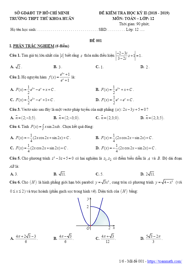 Trên đây chỉ là một số ví dụ về nội dung của đề thi học kì 2 môn Toán lớp 12 năm 2018-2019 của trường THPT Thủ Khoa Huân TP HCM. Đề thi này giúp học sinh thử sức, củng cố kiến thức và chuẩn bị tốt cho kỳ thi cuối năm.