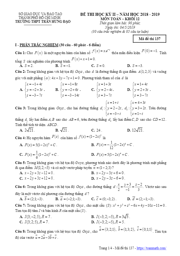 Đề thi học kì 2 (HK2) môn Toán lớp 12 năm 2018-2019 của trường THPT Trần Hưng Đạo TP HCM là cơ hội để học sinh thể hiện kiến thức và kỹ năng của mình sau một thời gian học tập khá dài. Đề thi gồm 30 câu trắc nghiệm và 5 câu tự luận, tổng cộng 10 điểm, thời gian làm bài là 90 phút.Trong đề thi, có một số câu hỏi khá thú vị và đòi hỏi sự tư duy logic của học sinh. Ví dụ, trong một câu hỏi, học sinh cần phải chứng minh hoặc bác bỏ một khẳng định liên quan đến mối quan hệ giữa đường thẳng và mặt phẳng trong không gian Oxyz. Câu hỏi khác đề cập đến việc tính phần thực và phần ảo của một số phức.Ngoài ra, có một câu hỏi đặc biệt liên quan đến mặt cầu và mặt phẳng, học sinh cần phải áp dụng kiến thức về hình học không gian để giải quyết vấn đề. Đây là cơ hội để học sinh thể hiện khả năng giải quyet vấn đề và ứng dụng kiến thức vào thực tế.Tóm lại, đề thi học kì 2 môn Toán lớp 12 của trường THPT Trần Hưng Đạo TP HCM không chỉ là bài kiểm tra chất lượng kiến thức mà còn là cơ hội để học sinh thể hiện tư duy logic và khả năng giải quyet vấn đề. Đến từng câu hỏi đều mang lại những tri thức cần thiết cho học sinh trước khi bước vào kỳ thi tốt nghiệp.