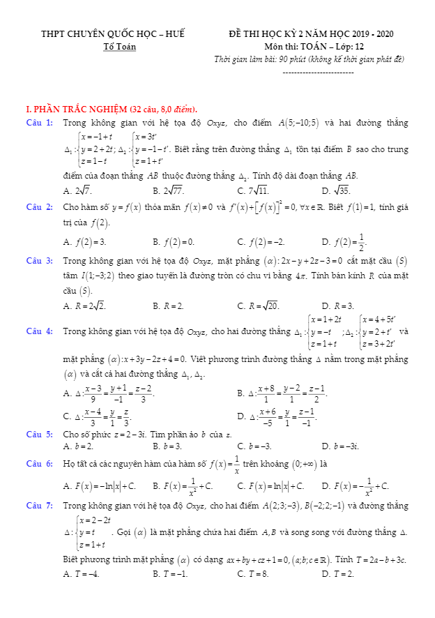 Đề thi học kỳ 2 Toán lớp 12 năm 2019-2020 trường THPT chuyên Quốc học Huế là cơ hội để học sinh thể hiện kiến thức và kỹ năng của mình trong môn Toán. Chúc các em đạt kết quả cao trong kỳ thi!