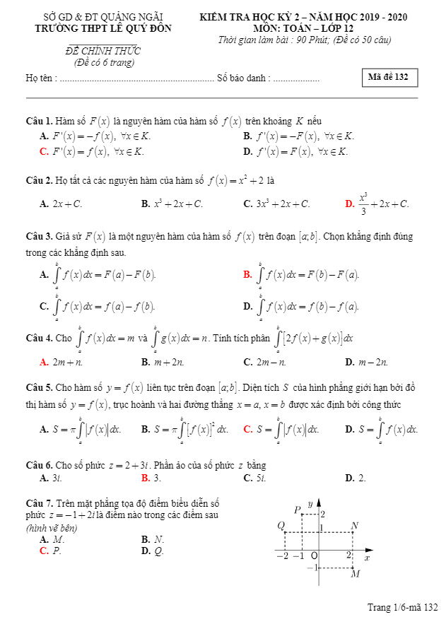 Sytu xin giới thiệu đến quý thầy cô giáo cùng các em học sinh đề thi HK2 Toán lớp 12 năm học 2019 – 2020 trường THPT Lê Quý Đôn – Quảng Ngãi. Đề thi bao gồm 06 trang với 50 câu hỏi và bài toán dạng trắc nghiệm khách quan, thời gian làm bài thi là 90 phút. Đề thi có đáp án mã đề 132, 356, 525.