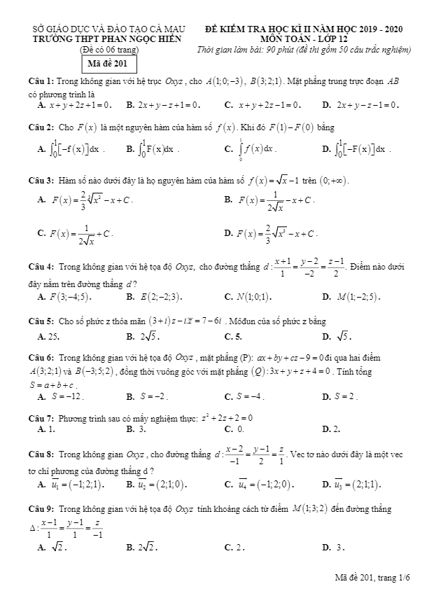 Ngày 18 tháng 06 năm 2020, trường THPT Phan Ngọc Hiển, huyện Năm Căn, tỉnh Cà Mau đã tổ chức kỳ thi kiểm tra chất lượng môn Toán lớp 12 giai đoạn cuối học kỳ 2 năm học 2019 – 2020. Đề thi HK2 Toán lớp 12 năm 2019 – 2020 trường THPT Phan Ngọc Hiển – Cà Mau (mã đề 201) gồm 50 câu trắc nghiệm, thời gian làm bài 90 phút.