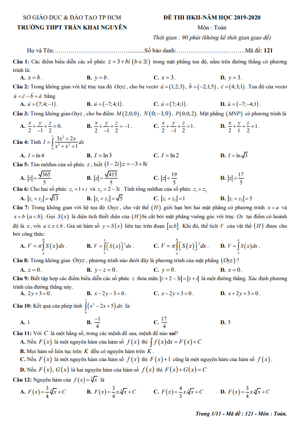 Đề thi học kì 2 Toán lớp 12 năm 2019 – 2020 trường THPT Trần Khai Nguyên TP HCM là công cụ hữu ích để giúp các em học sinh ôn tập và chuẩn bị cho kỳ thi cuối học kỳ 2 sắp tới. Đề thi bao gồm nhiều câu hỏi có độ khó từ cơ bản đến nâng cao, giúp học sinh rèn luyện kỹ năng giải các bài toán Toán một cách chắc chắn và hiệu quả.