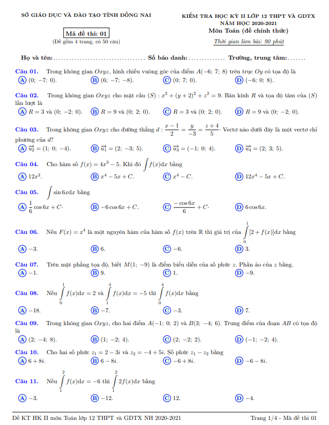 Ngày 27 tháng 04 năm 2021, sở Giáo dục và Đào tạo tỉnh Đồng Nai đã tổ chức kiểm tra chất lượng môn Toán cho học sinh lớp 12 THPT và GDTX giai đoạn cuối học kỳ 2 năm học 2020-2021. Đề thi bao gồm mã đề 12 với 50 câu trắc nghiệm trên 04 trang, thời gian làm bài là 90 phút. Đề thi được cung cấp đáp án và lời giải chi tiết ở mã đề 01.