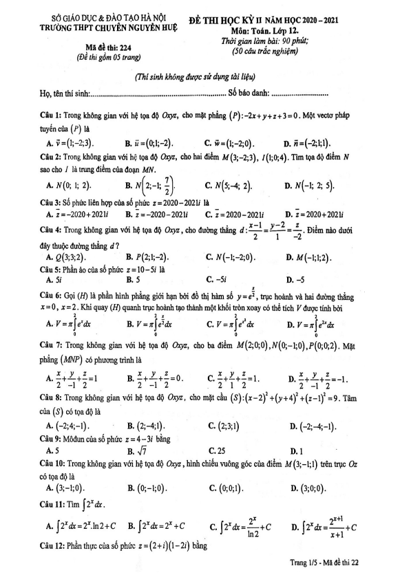 Đề thi học kì 2 (HK2) lớp 12 môn Toán năm 2020 2021 trường chuyên Nguyễn Huệ Hà Nội