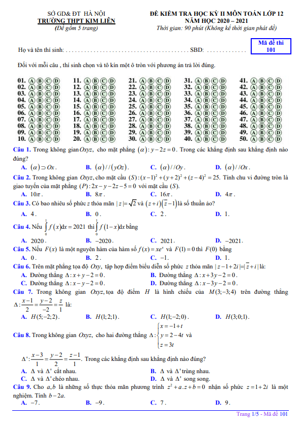 Chào mừng đến với bài thi học kỳ 2 môn Toán lớp 12 năm học 2020 – 2021 của trường THPT Kim Liên, Hà Nội! Đề thi này được biên soạn với hình thức 100% trắc nghiệm, gồm 50 câu hỏi và bài toán, thời gian làm bài là 90 phút. Đề thi được chia thành 4 mã đề trắc nghiệm: 101, 102, 103, 104.