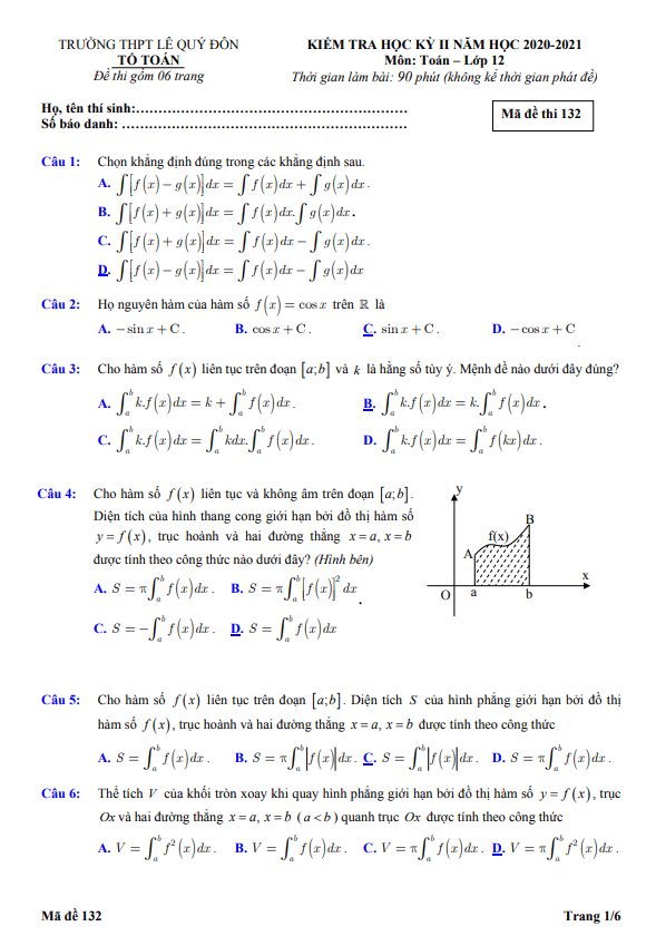 Sytu xin giới thiệu đến quý thầy, cô giáo và các em học sinh lớp 12 đề thi học kỳ 2 Toán lớp 12 năm học 2020 – 2021 trường THPT Lê Quý Đôn, huyện Bình Sơn, tỉnh Quảng Ngãi. Đề thi bao gồm mã đề 132, 468, 672 và có đáp án cụ thể. Đề thi bao gồm các câu hỏi vận dụng cao, cần sự chú ý và suy luận logic để trả lời.