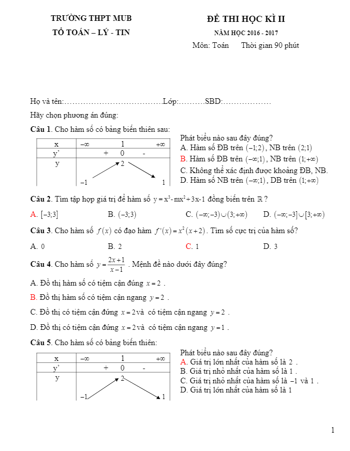 Đề thi học kì 2 (HK2) lớp 12 môn Toán năm học 2016 – 2017 trường THPT Mường Bi Hòa Bình