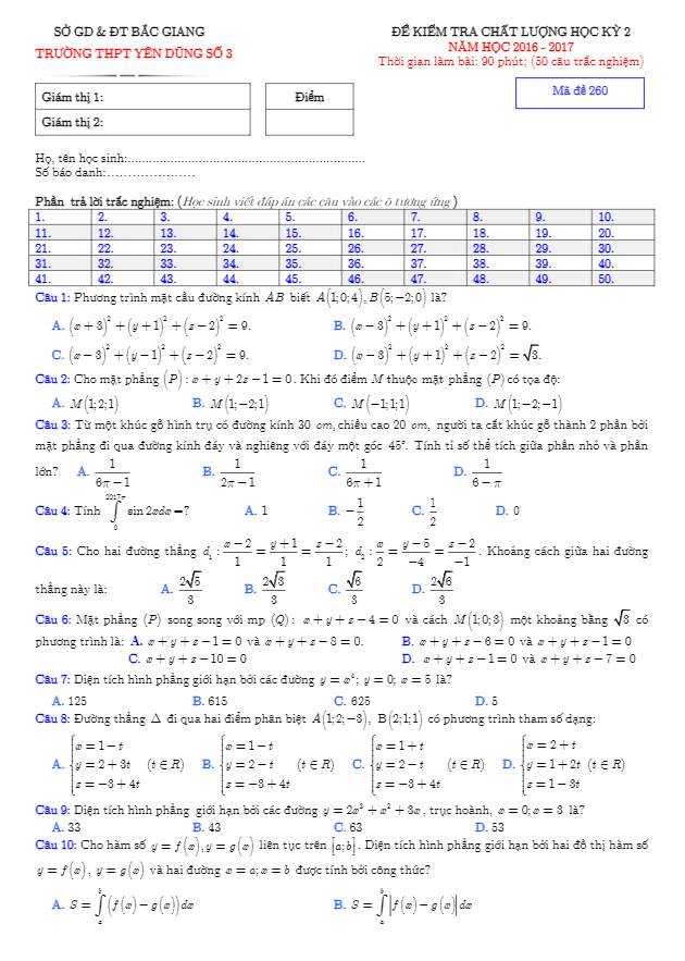 Đề thi học kì 2 (HK2) lớp 12 môn Toán năm học 2016-2017 trường THPT Yên Dũng 3 Bắc Giang