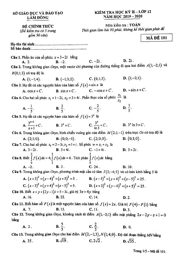 Vào ngày … tháng 06 năm 2020, sở Giáo dục và Đào tạo tỉnh Lâm Đồng đã tổ chức kỳ thi kiểm tra chất lượng môn Toán cho học sinh lớp 12 trong giai đoạn cuối học kỳ 2 (HK2) năm học 2019 – 2020. Đề thi môn Toán lớp 12 năm học 2019 – 2020 sở GD&ĐT Lâm Đồng có mã đề 101, bao gồm 05 trang với 50 câu trắc nghiệm và thời gian làm bài thi là 90 phút. Nội dung thi tập trung vào các chủ đề chính như nguyên hàm, tích phân và ứng dụng, số phức, phương pháp tọa độ trong không gian. Đề thi có đáp án mã đề 101, 102, 103, 104.