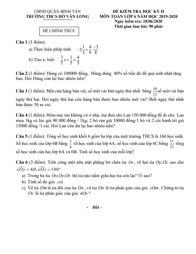 Xin chào quý thầy cô giáo và các em học sinh! Dưới đây là file PDF đề thi Học kỳ 2 môn Toán lớp 6 năm học 2019 – 2020 của trường THCS Hồ Văn Long, quận Bình Tân, thành phố Hồ Chí Minh. Đề thi bao gồm đáp án, lời giải chi tiết và hướng dẫn chấm điểm.