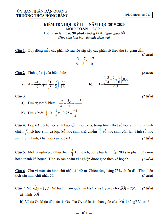 Đề thi học kỳ 2 (HK2) lớp 6 môn Toán năm 2019 2020 trường THCS Hồng Bàng TP HCM