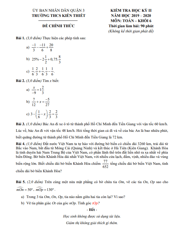 Đề thi học kỳ 2 (HK2) lớp 6 môn Toán năm 2019 2020 trường THCS Kiến Thiết TP HCM