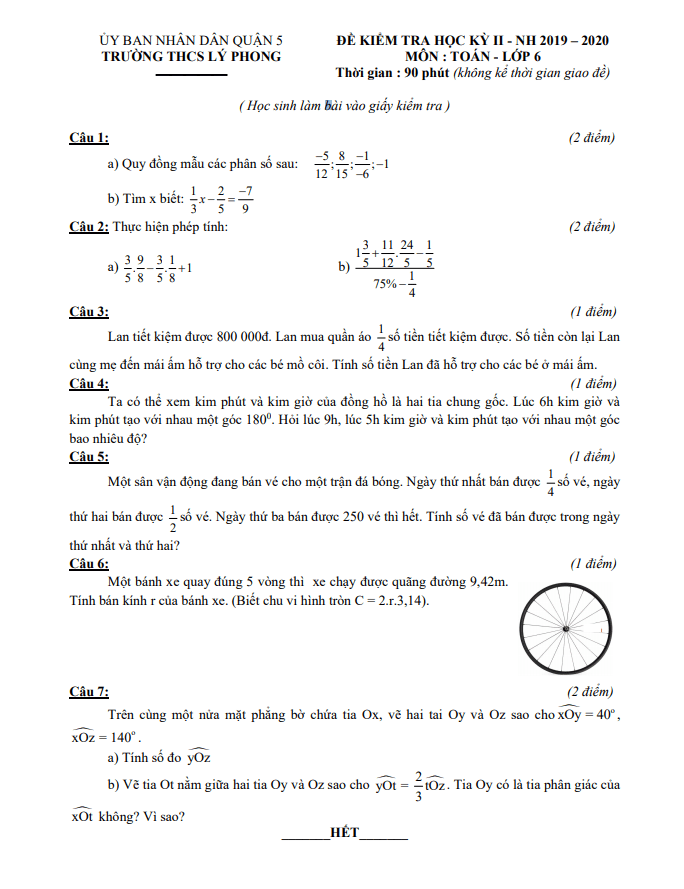 Đề thi học kì 2 Toán lớp 6 năm 2019 – 2020 trường THCS Lý Phong TP HCM