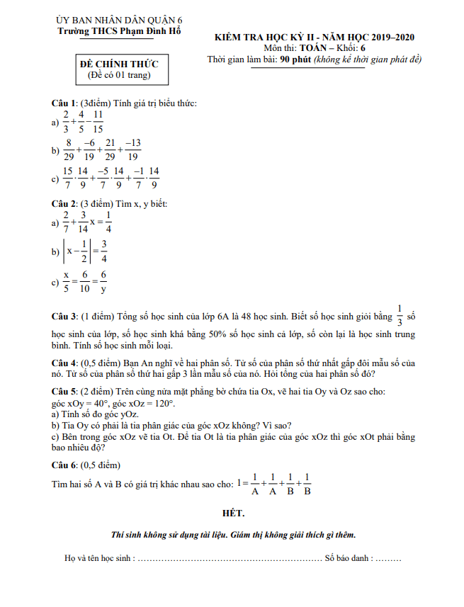 Đề thi học kì 2 (HK2) lớp 6 môn Toán năm 2019-2020 trường THCS Phạm Đình Hổ TP HCM