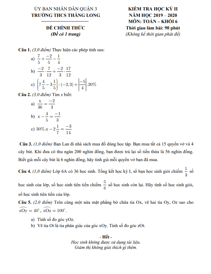 Đề thi học kì 2 (HK2) lớp 6 môn Toán năm 2019 2020 trường THCS Thăng Long TP HCM