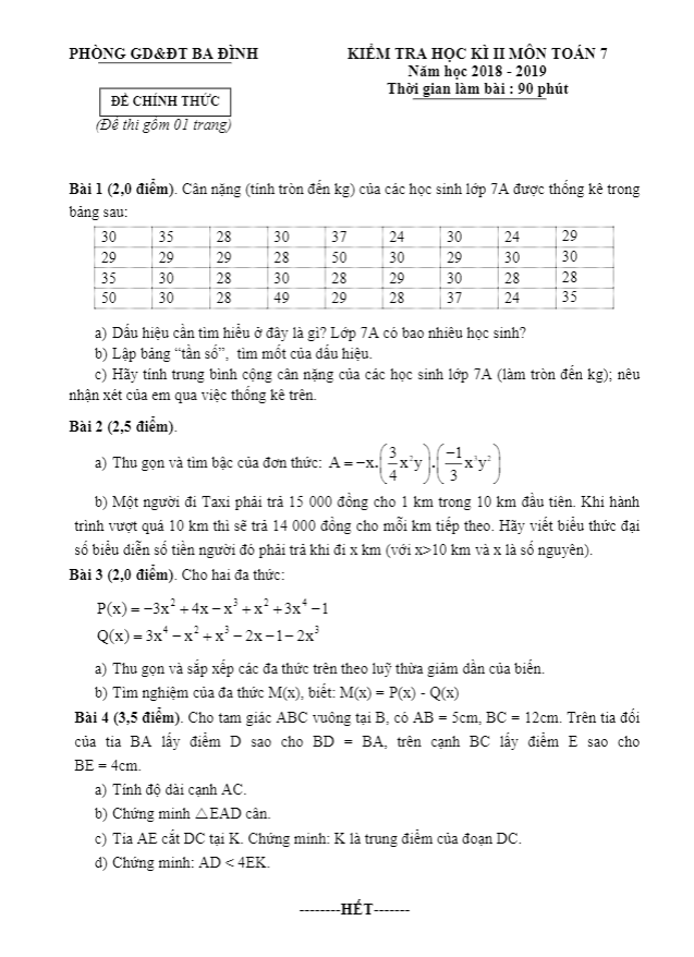 Vừa qua, phòng Giáo dục và Đào tạo quận Ba Đình – Hà Nội đã tổ chức kỳ thi kiểm tra chất lượng học kỳ 2 môn Toán lớp 7 năm học 2018 – 2019, nhằm đánh giá khả năng tiếp thu kiến thức môn Toán của học sinh lớp 7. Đề thi gồm 01 trang, biên soạn theo dạng đề tự luận với 04 bài toán, học sinh thực hiện trong 90 phút. Đề thi có lời giải chi tiết và thang chấm điểm để đánh giá học lực.