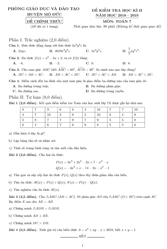 Đề thi học kì 2 môn Toán lớp 7 năm 2018 – 2019 của phòng GD&ĐT Mộ Đức – Quảng Ngãi có cấu trúc như sau: