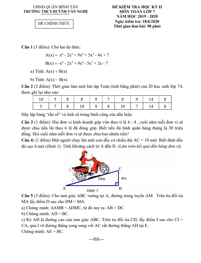 Trích đề thi học kì 2 Toán lớp 7 năm 2019 – 2020 tại trường THCS Huỳnh Văn Nghệ: