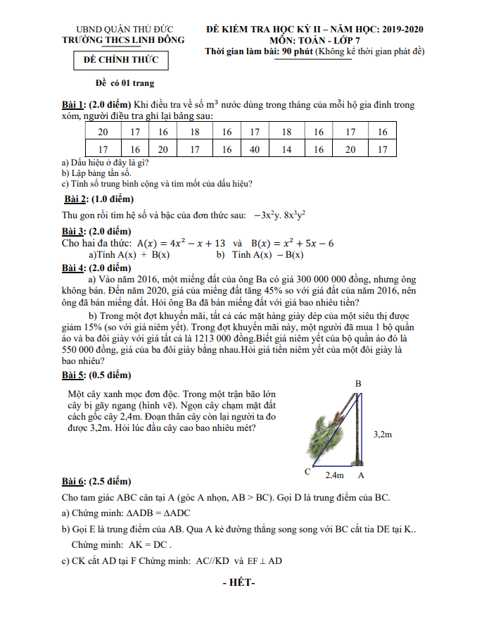 Đề thi học kỳ 2 Toán lớp 7 năm 2019 – 2020