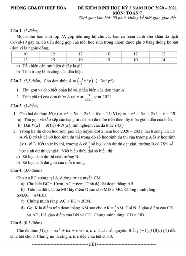 Đề thi học kỳ 2 Toán lớp 7 năm học 2020 – 2021 phòng GD&ĐT Hiệp Hòa – Bắc Giang