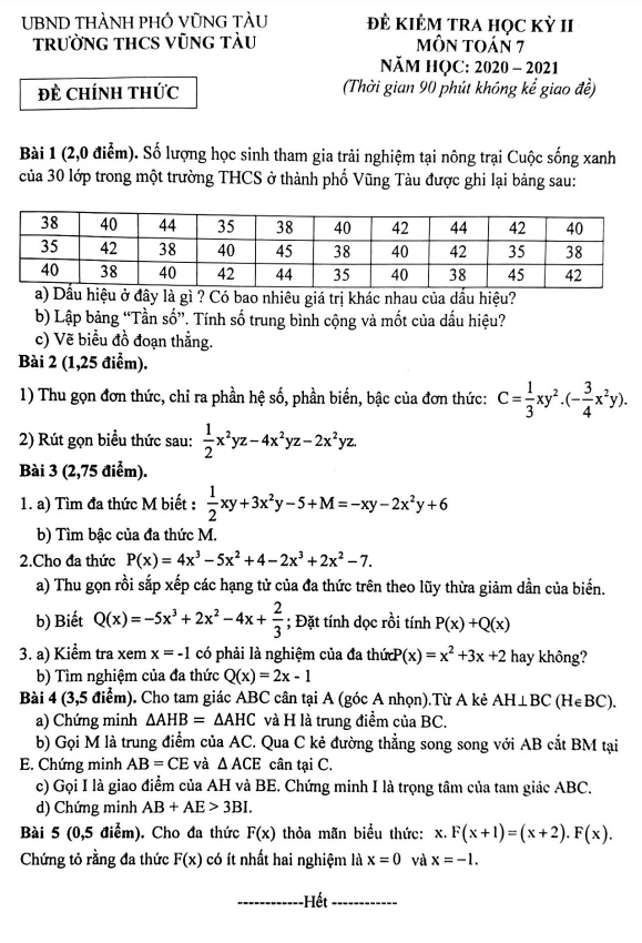 Đề thi học kỳ 2 môn Toán lớp 7 năm học 2020 – 2021 tại trường THCS Vũng Tàu, tỉnh Bà Rịa – Vũng Tàu bao gồm 01 trang với 05 bài toán dạng tự luận, thời gian làm bài là 90 phút. Dưới đây là một số câu hỏi được trích dẫn từ đề thi: