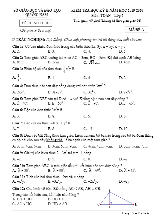 Đề thi học kỳ 2 Toán lớp 7 năm học 2019 – 2020 tại sở GD&ĐT Quảng Nam được tổ chức để đánh giá chất lượng dạy và học môn Toán của giáo viên và học sinh tại các trường THCS trong tỉnh. Đề thi bao gồm hai mã đề A và B, có tổng cộng 15 câu trắc nghiệm và 03 câu tự luận, được chia thành 05 điểm cho phần trắc nghiệm và 05 điểm cho phần tự luận. Thời gian làm bài là 60 phút, đề thi đi kèm đáp án và lời giải chi tiết.Trong đề thi có một câu hỏi về việc một nhóm học sinh lớp 7A góp tiền ủng hộ cho các bạn khó khăn trong đợt dịch Covid-19. Học sinh được yêu cầu phân tích dấu hiệu và lập bảng tần số của số tiền đóng góp. Câu hỏi tiếp theo yêu cầu học sinh chứng minh các mệnh đề liên quan đến tam giác cân và trọng tâm của tam giác đó.Cuối cùng, đề thi cũng yêu cầu học sinh áp dụng bất đẳng thức tam giác để kiểm tra xem các bộ ba đoạn thẳng cho trước có thể tạo thành tam giác hay không. Bằng cách này, đề thi không chỉ kiểm tra kiến thức cơ bản mà còn khuyến khích học sinh áp dụng kiến thức vào thực tế và phát triển kỹ năng logic và suy luận của học sinh.