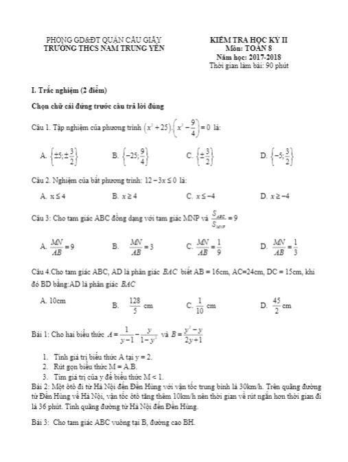 Đề thi học kì 2 Toán lớp 8 năm 2017 – 2018 trường THCS Nam Trung Yên – Hà Nội