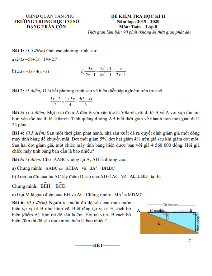 Đề thi học kì 2 (HK2) lớp 8 môn Toán năm 2019-2020 trường THCS Đặng Trần Côn TP HCM