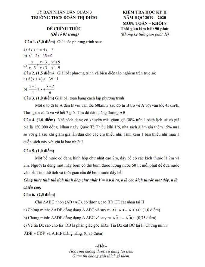 Đề thi học kì 2 (HK2) lớp 8 môn Toán năm 2019-2020 trường THCS Đoàn Thị Điểm TP HCM
