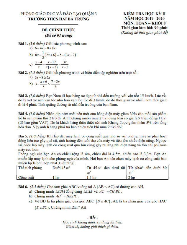 Đề thi học kì 2 (HK2) lớp 8 môn Toán năm 2019-2020 trường THCS Hai Bà Trưng TP HCM