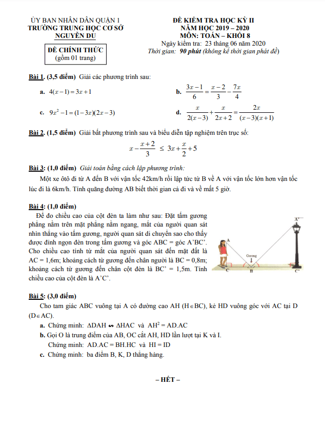 Đề thi học kì 2 (HK2) lớp 8 môn Toán năm 2019 2020 trường THCS Nguyễn Du TP HCM