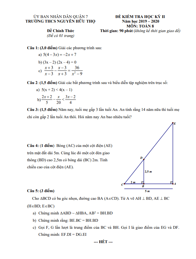 Trích dẫn đề thi HK2 Toán lớp 8 năm 2019 – 2020 trường THCS Nguyễn Hữu Thọ – TP HCM: