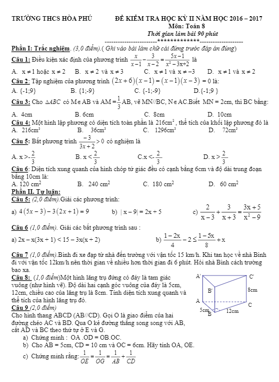 Đề thi học kì 2 (HK2) lớp 8 môn Toán năm học 2016-2017 trường THCS Hòa Phú TP. HCM