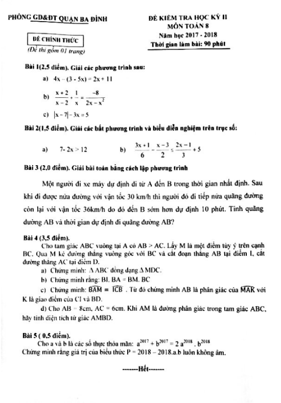 Đề thi học kì 2 (HK2) lớp 8 môn Toán năm học 2017 2018 phòng GD và ĐT Ba Đình Hà Nội