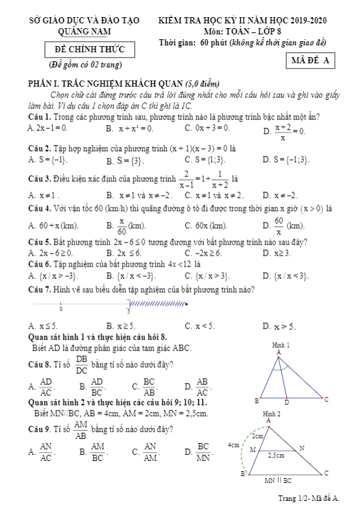 Đề thi học kì 2 (HK2) lớp 8 môn Toán năm học 2019 – 2020 sở GD ĐT Quảng Nam