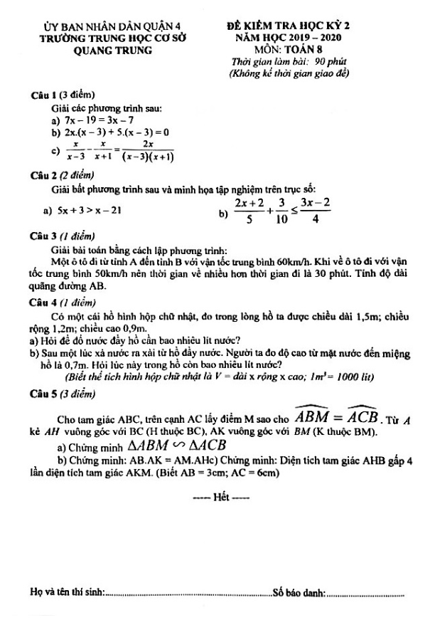 Hãy cùng tìm hiểu về đề thi học kì 2 môn Toán lớp 8 năm học 2019-2020 tại trường THCS Quang Trung, quận 4, thành phố Hồ Chí Minh.