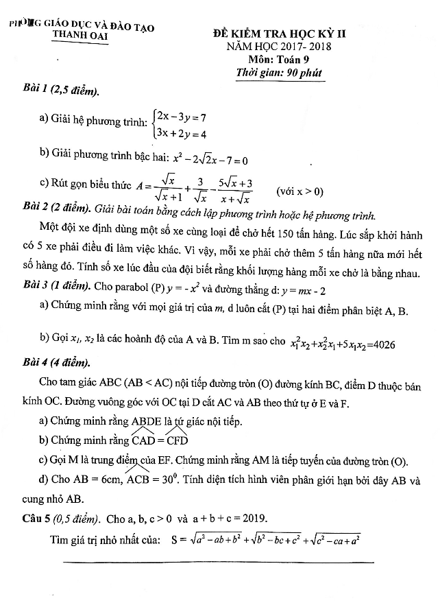 Đề thi học kì 2 Toán lớp 9 năm 2017 – 2018 phòng GD và ĐT Thanh Oai – Hà Nội