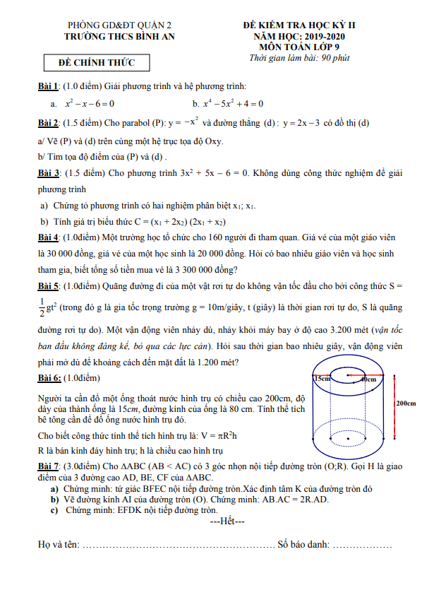 Đề thi học kì 2 Toán lớp 9 năm 2019-2020 trường THCS Bình An TP HCM
