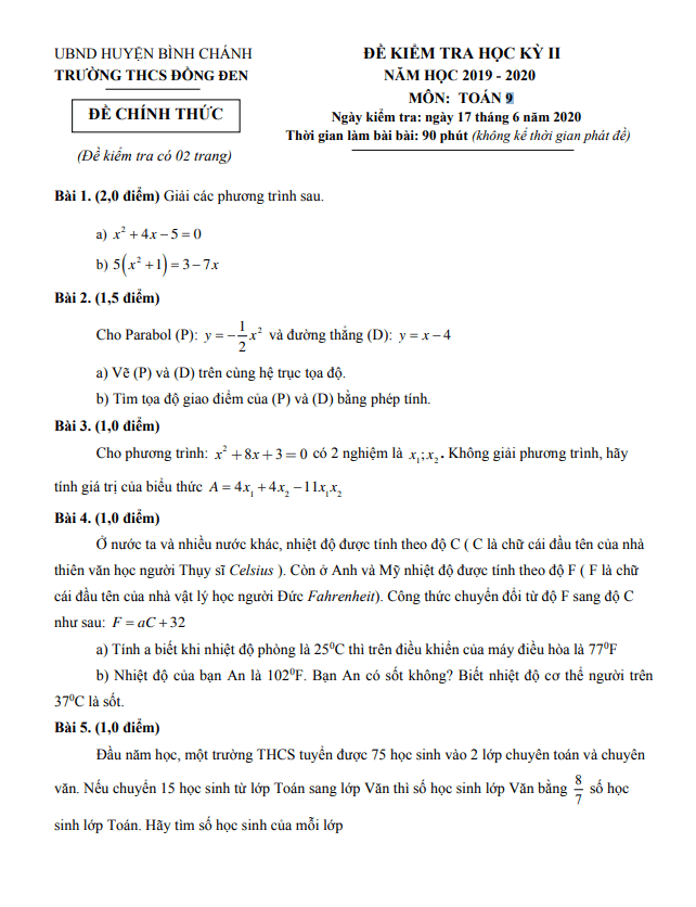 Đề Thi Học Kì 2 Môn Toán Lớp 9 Năm 2019-2020 Trường THCS Đồng Đen TP HCM