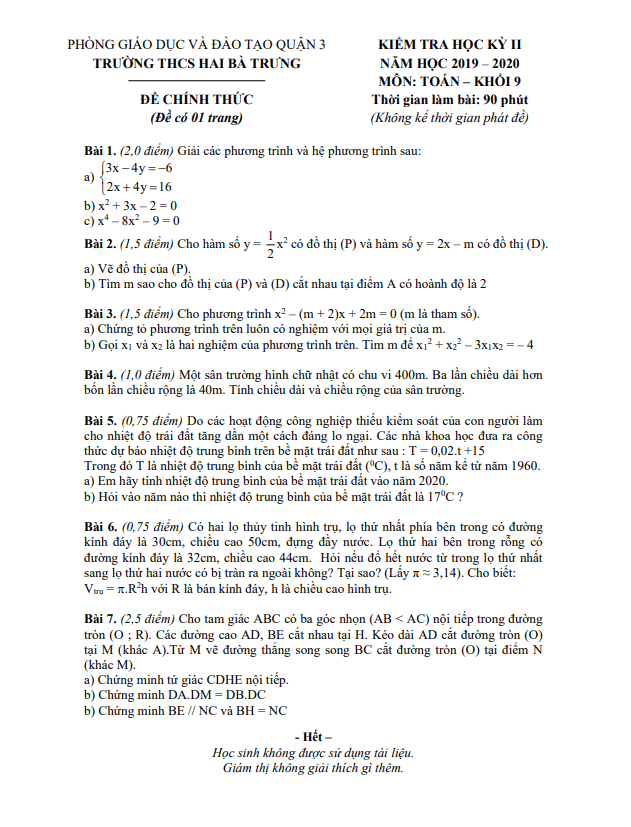 Đề thi học kỳ 2 (HK2) lớp 9 môn Toán năm 2019 2020 trường THCS Hai Bà Trưng TP HCM