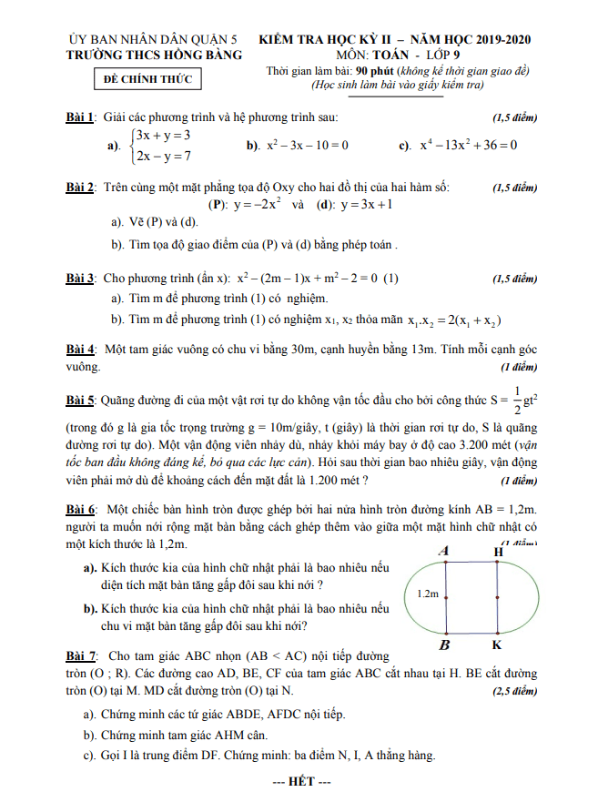 Đề thi học kỳ 2 (HK2) lớp 9 môn Toán năm 2019 2020 trường THCS Hồng Bàng TP HCM