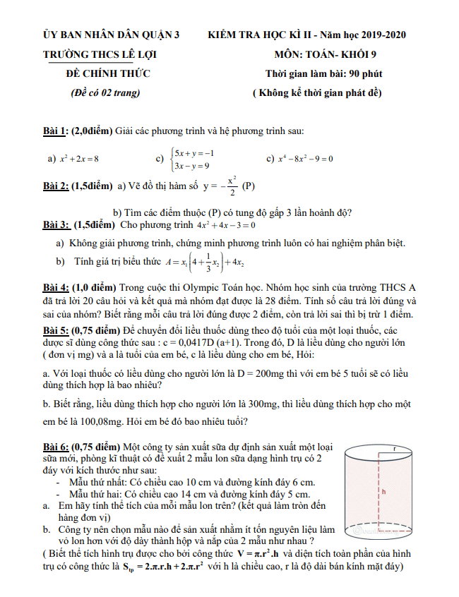Đề thi học kì 2 Toán lớp 9 năm 2019 – 2020 trường THCS Lê Lợi TP HCM