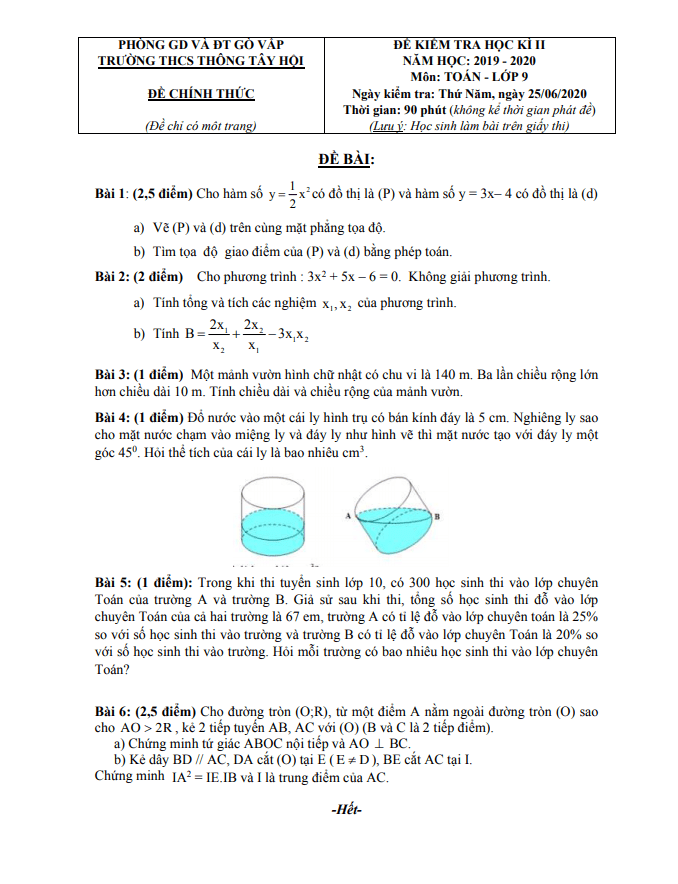 Chia sẻ đề thi Học kì 2 Toán lớp 9 năm học 2019-2020